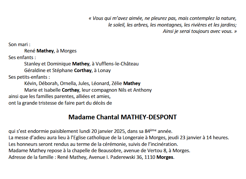 Madame Chantal MATHEY-DESPONT 17 mai. 1941 - 20 jan. 2025 Avis mortuaire PFG Télecharger PDF Partager sur: Galerie