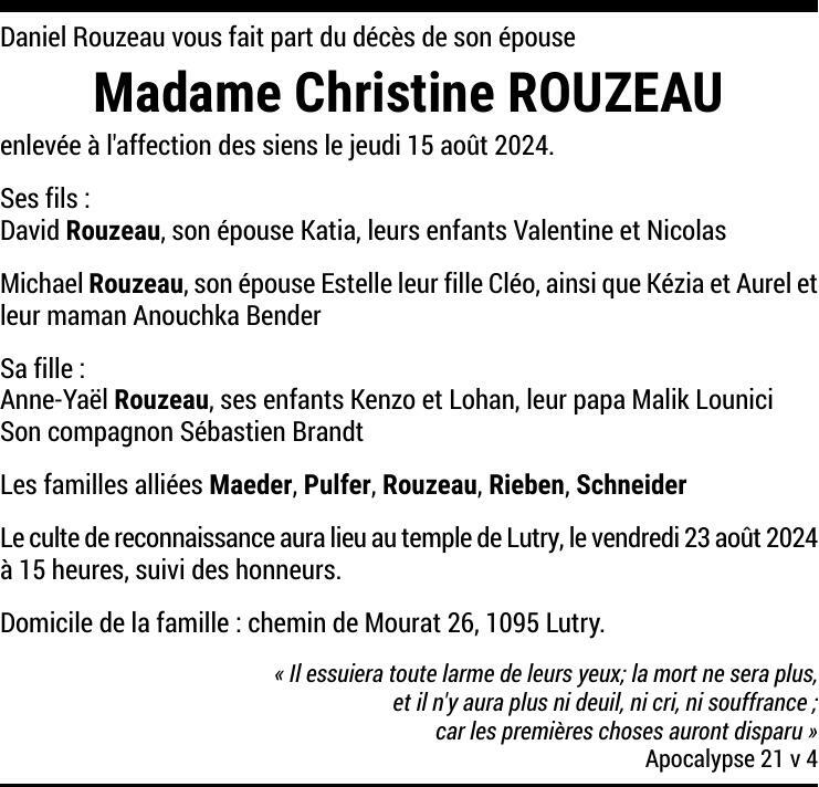 Madame Christine ROUZEAU 18 oct. 1952 - 15 aoû. 2024 Avis mortuaire PFG Partager sur: Galerie PreviousNext PreviousNext