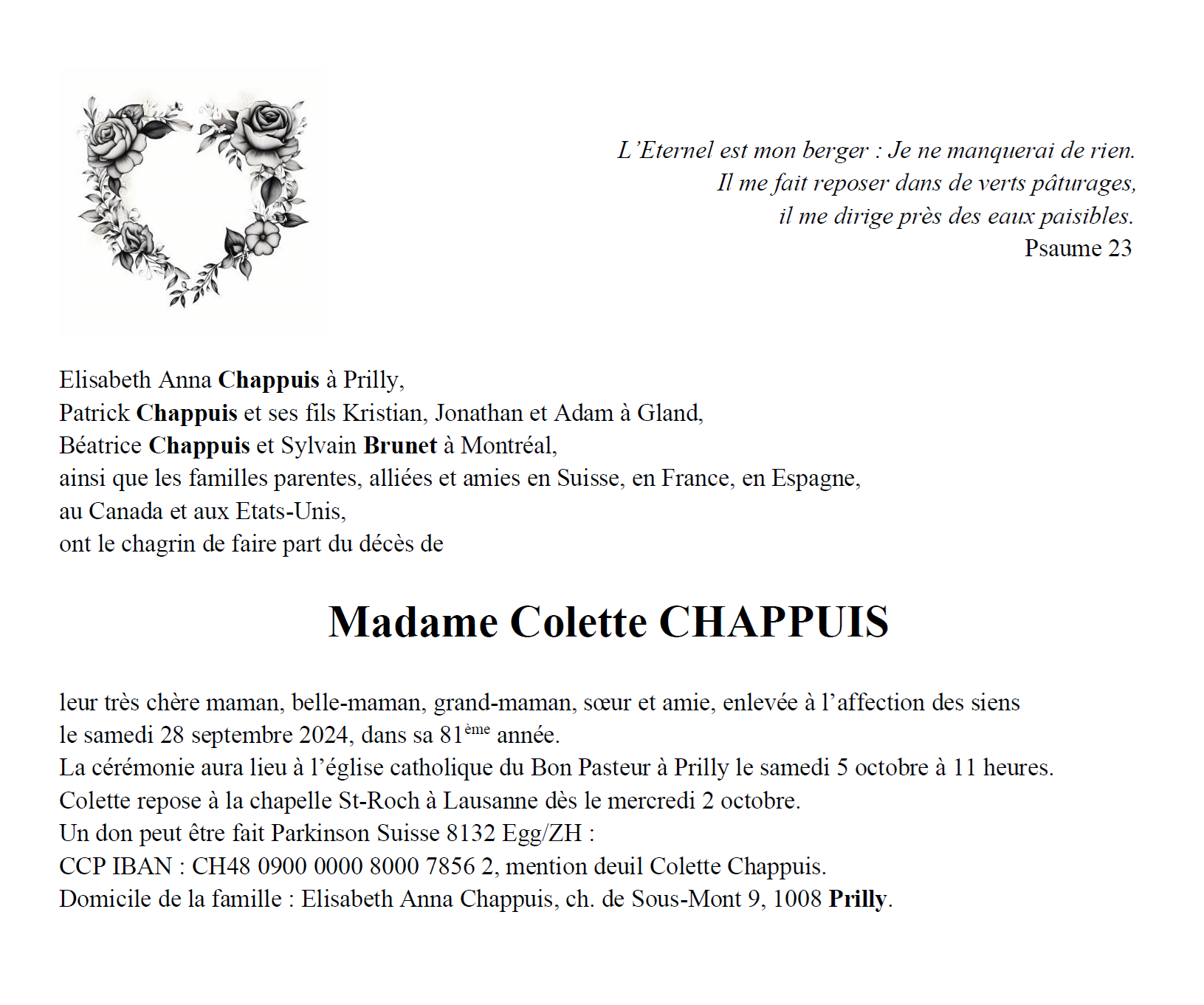 Madame Colette CHAPPUIS 15 fév. 1944 - 28 sep. 2024 Avis mortuaire PFG Télecharger PDF Partager sur: Galerie PreviousNext PreviousNext