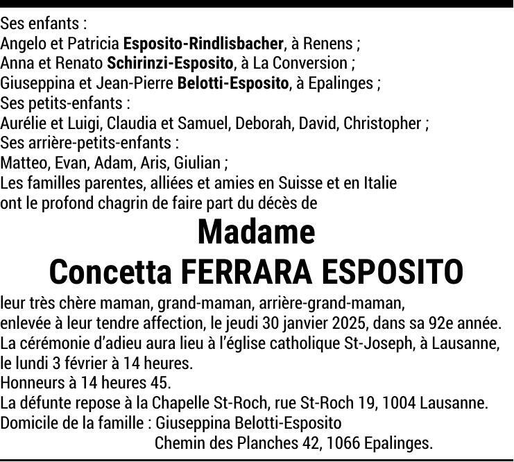 Madame Concetta FERRARA ESPOSITO 27 nov. 1933 - 30 jan. 2025 Avis mortuaire PFG Partager sur: Galerie