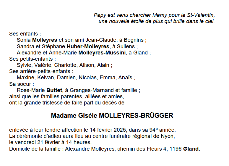 Madame Gisèle MOLLEYRES-BRÜGGER 03 nov. 1931 - 14 fév. 2025 Avis mortuaire PFG Télecharger PDF Partager sur: Galerie