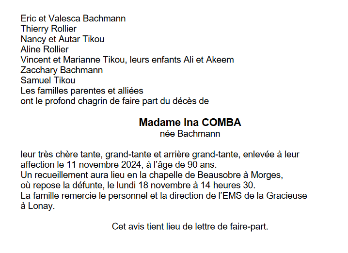Madame Ina COMBA 08 avr. 1934 - 11 nov. 2024 Avis mortuaire PFG Télecharger PDF Partager sur: Galerie