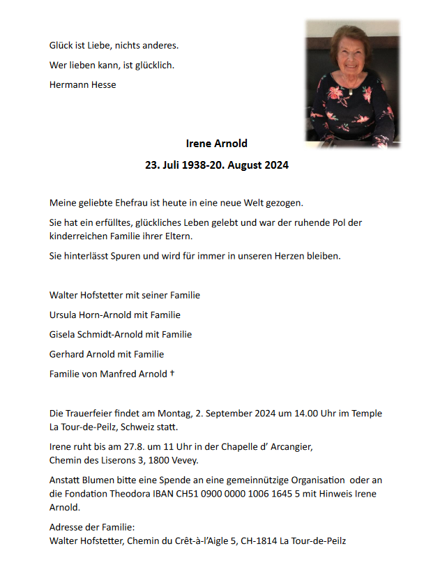 Madame Irene ARNOLD 23 juil. 1938 - 20 aoû. 2024 Avis mortuaire PFG Télecharger PDF Partager sur: Galerie PreviousNext PreviousNext