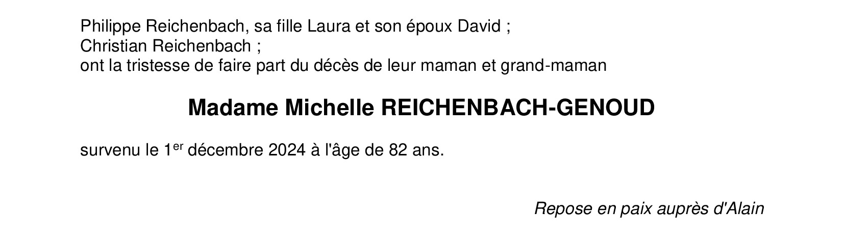Madame Michelle REICHENBACH-GENOUD 09 avr. 1942 - 01 déc. 2024 Avis mortuaire PFG Partager sur: Galerie