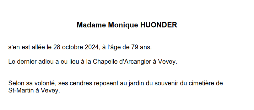 Madame Monique HUONDER 03 mai. 1945 - 28 oct. 2024 Avis mortuaire PFG Télecharger PDF Partager sur: Galerie