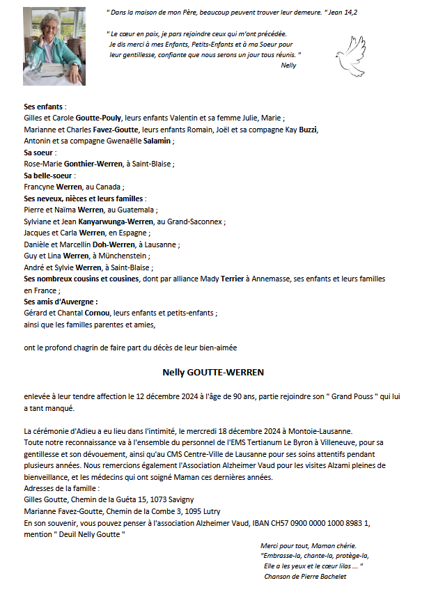 Madame Nelly GOUTTE-WERREN 23 jan. 1934 - 12 déc. 2024 Avis mortuaire PFG Télecharger PDF Partager sur: Galerie