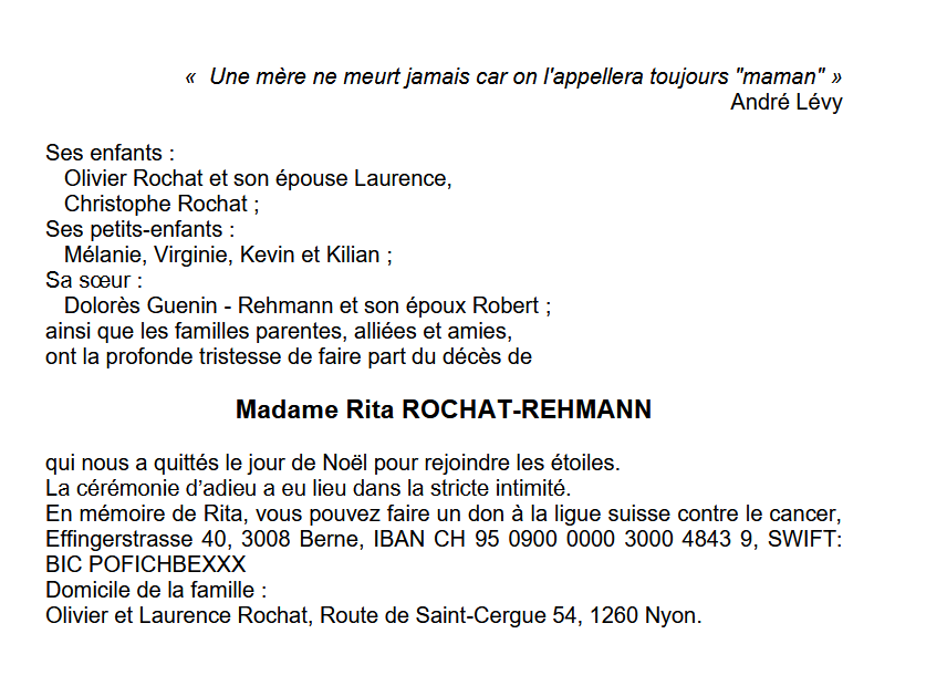 Madame Rita ROCHAT-REHMANN 23 fév. 1936 - 25 déc. 2024 Avis mortuaire PFG Télecharger PDF Partager sur: Galerie