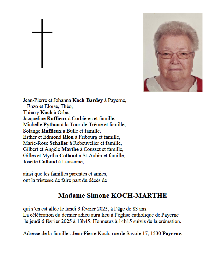 Madame Simone KOCH-MARTHE 22 fév. 1941 - 03 fév. 2025 Avis mortuaire PFG Télecharger PDF Partager sur: Galerie PreviousNext PreviousNext
