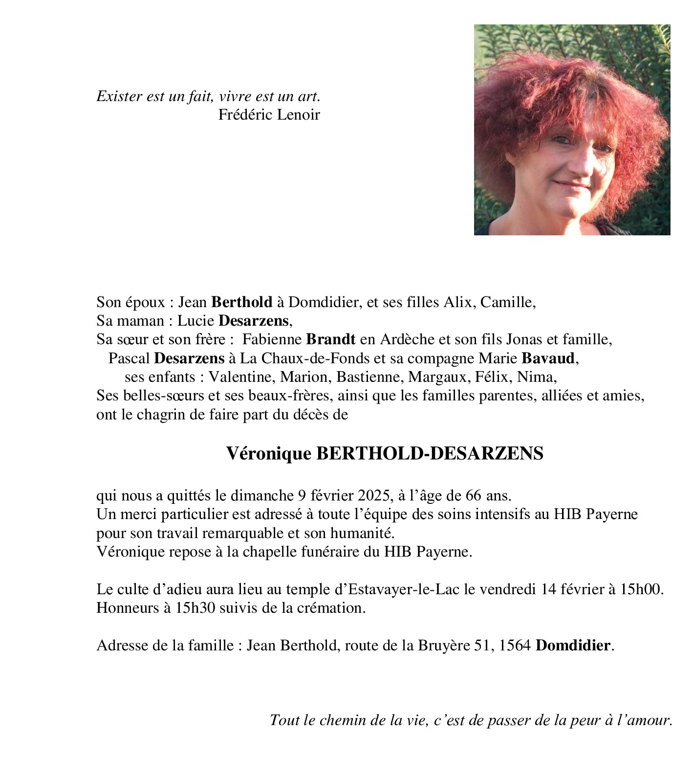 Madame Véronique BERTHOLD-DESARZENS 07 sep. 1959 - 09 fév. 2025 Avis mortuaire PFG Partager sur: Galerie