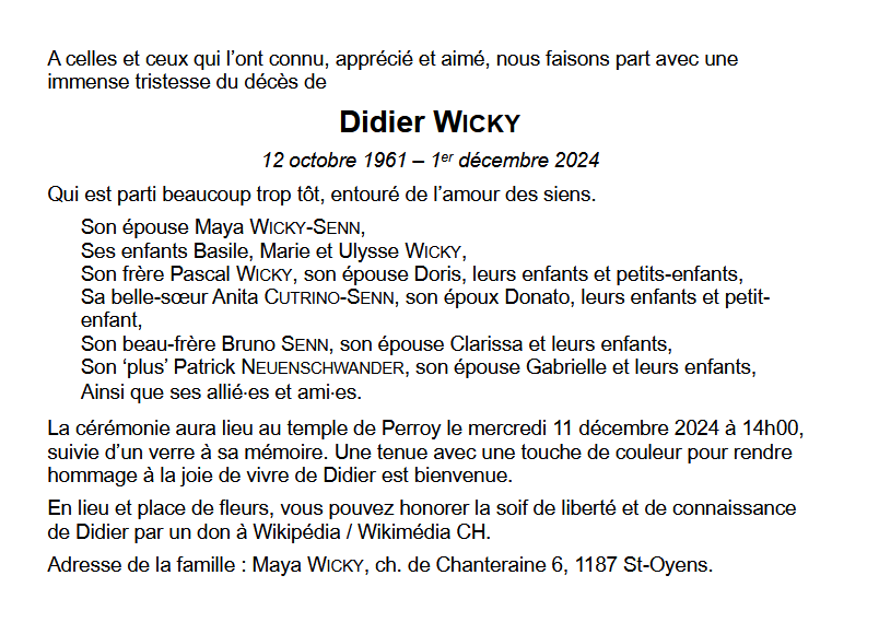 Monsieur Didier WICKY 12 oct. 1961 - 01 déc. 2024 Avis mortuaire PFG Télecharger PDF Partager sur: Galerie PreviousNext PreviousNext