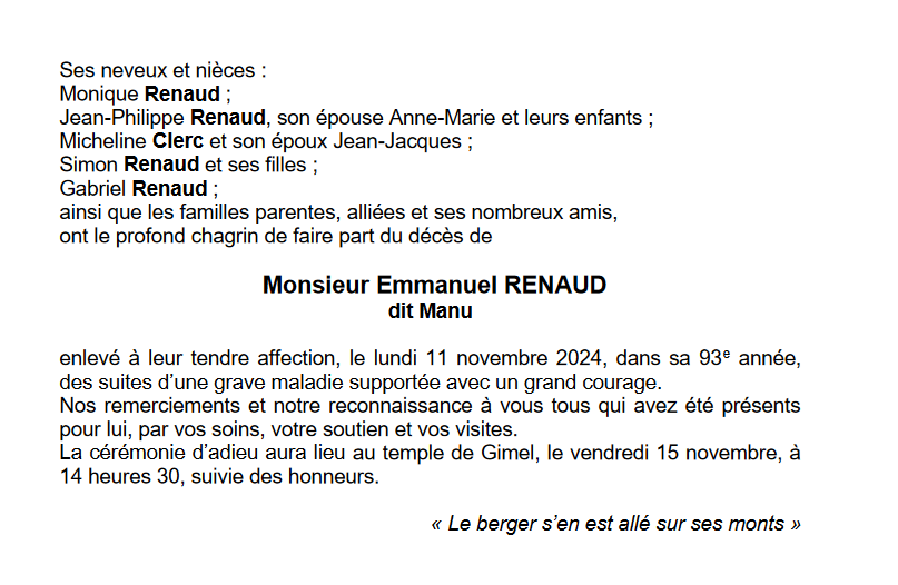 Monsieur Emmanuel RENAUD 19 mar. 1932 - 11 nov. 2024 Avis mortuaire PFG Télecharger PDF Partager sur: Galerie PreviousNext PreviousNext