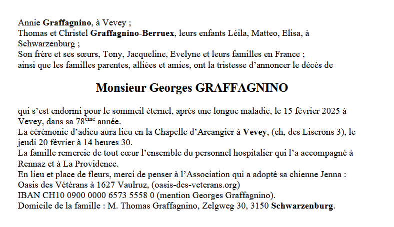 Monsieur Georges GRAFFAGNINO 12 mai. 1947 - 15 fév. 2025 Avis mortuaire PFG Télecharger PDF Partager sur: Galerie