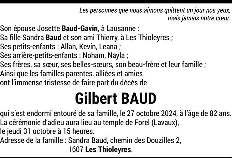 Monsieur Gilbert BAUD 18 oct. 1942 - 27 oct. 2024 Avis mortuaire PFG Partager sur: Galerie PreviousNext PreviousNext