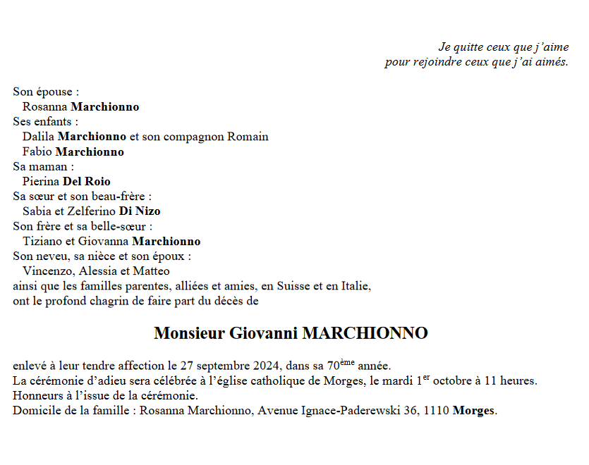 Monsieur Giovanni MARCHIONNO 28 nov. 1954 - 27 sep. 2024 Avis mortuaire PFG Télecharger PDF Partager sur: Galerie PreviousNext PreviousNext