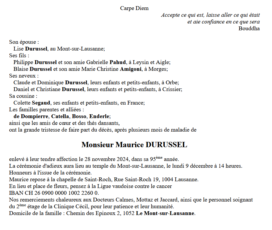 Monsieur Maurice DURUSSEL 07 juin. 1930 - 28 nov. 2024 Avis mortuaire PFG Télecharger PDF Partager sur: Galerie PreviousNext PreviousNext