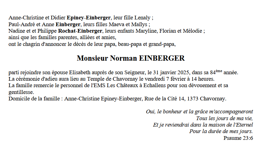 Monsieur Norman EINBERGER 09 fév. 1941 - 31 jan. 2025 Avis mortuaire PFG Télecharger PDF Partager sur: Galerie