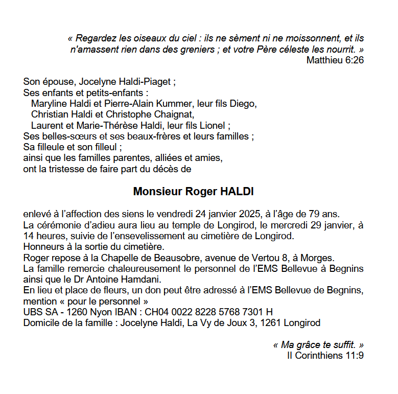 Monsieur Roger HALDI 30 déc. 1945 - 24 jan. 2025 Avis mortuaire PFG Télecharger PDF Partager sur: Galerie