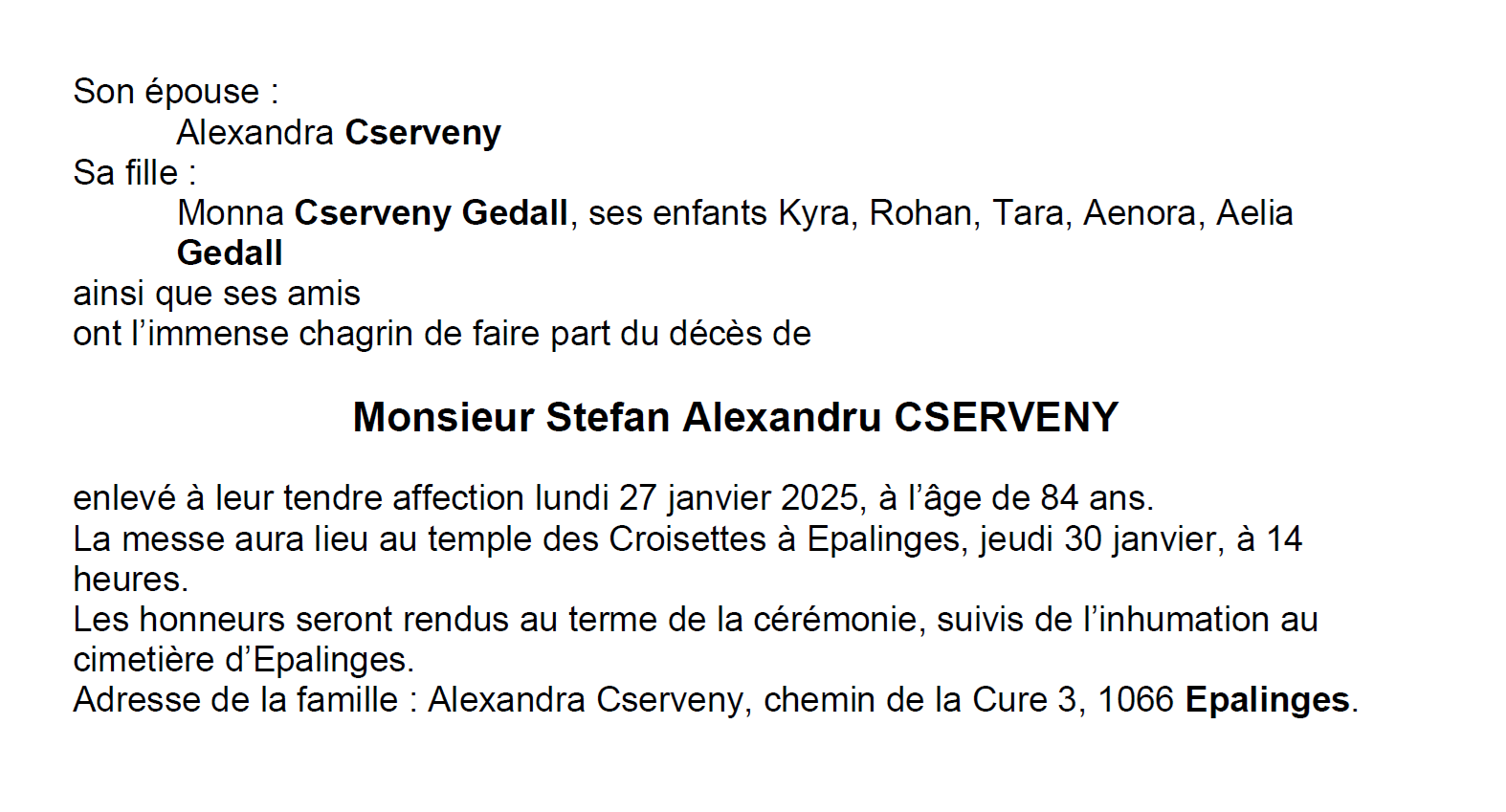 Monsieur Stefan Alexandru CSERVENY 11 jan. 1941 - 27 jan. 2025 Avis mortuaire PFG Télecharger PDF Partager sur: Galerie