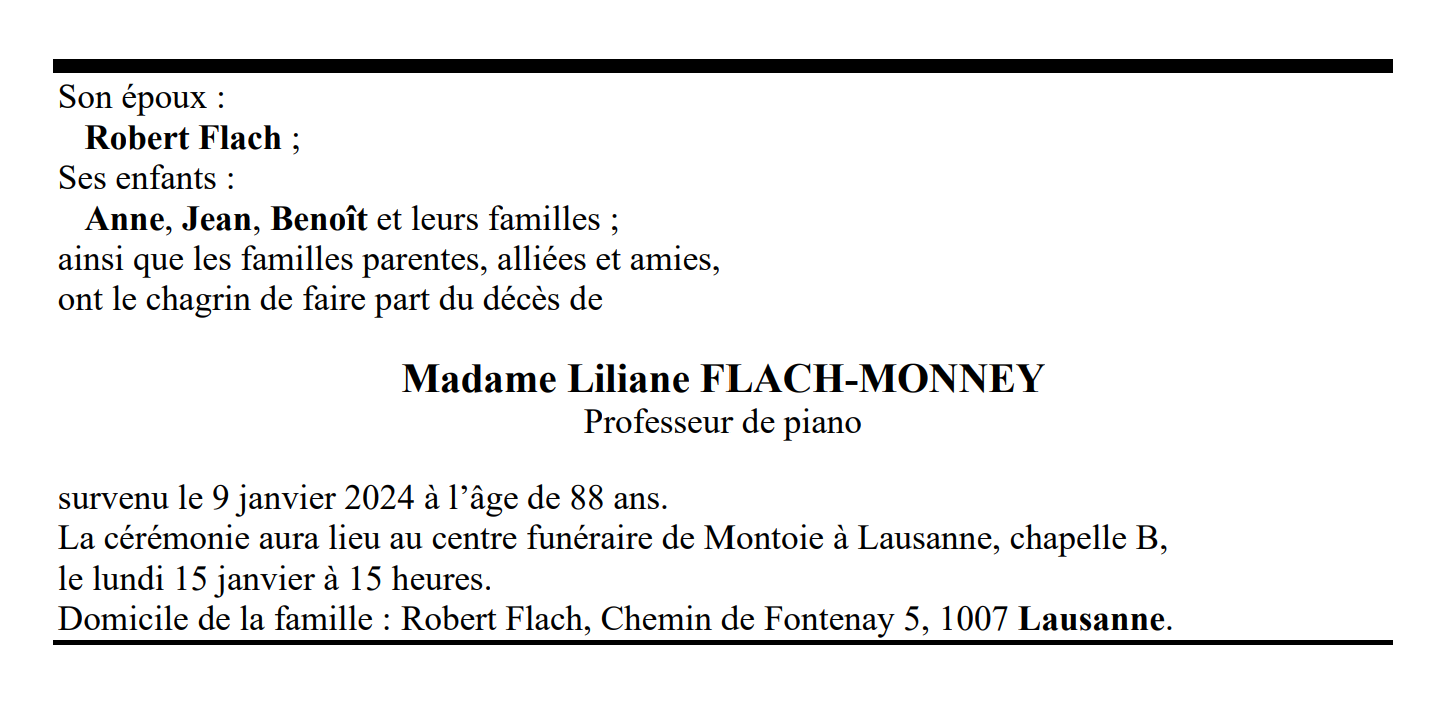 Madame Liliane FLACH-MONNEY Professeur de piano 07 oct. 1935 - 09 jan. 2024 Avis mortuaire PFG Télecharger PDF Partager sur: Galerie PreviousNext PreviousNext